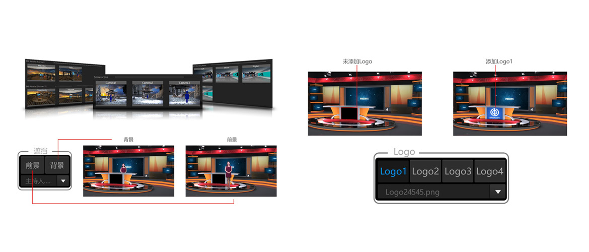 虚拟摄像机移动轨迹可编辑,支持四通道三维虚拟场景输入,每个场景可通过编辑器设置多个虚拟镜头。